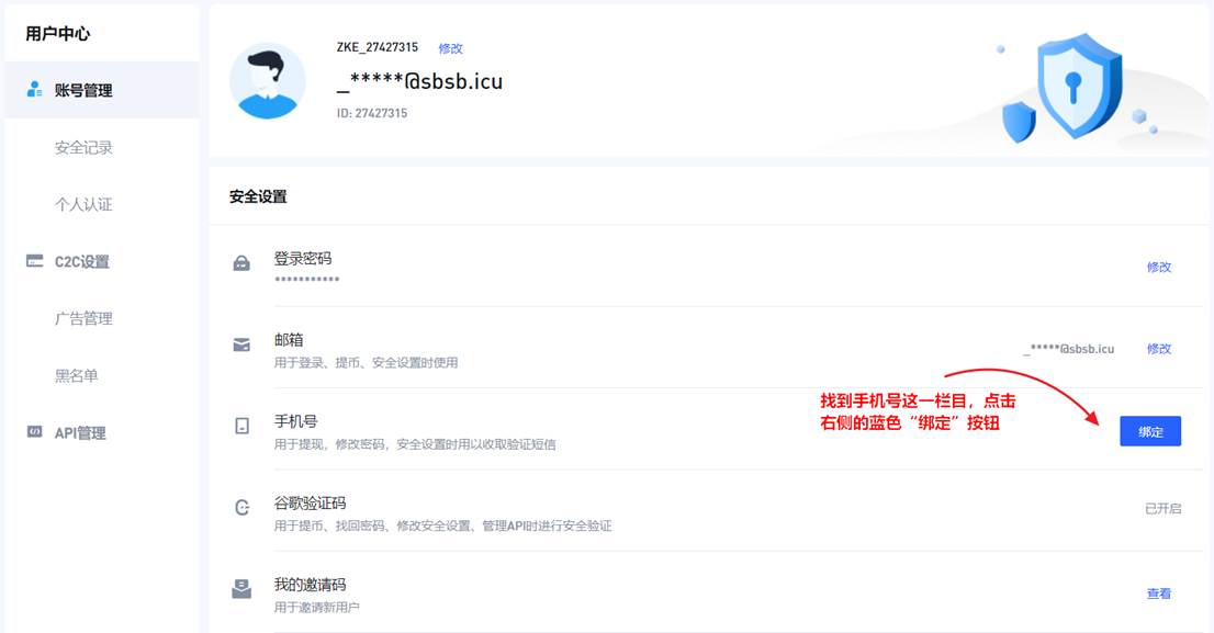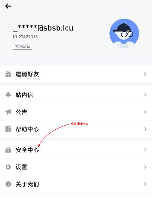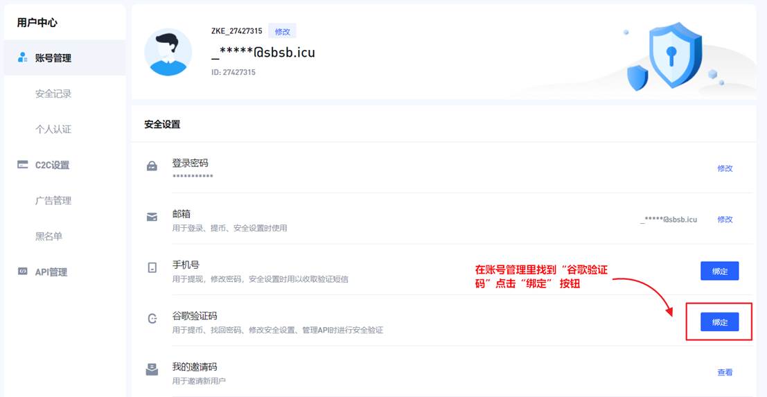 点击 安全中心 进入安全中心绑定谷歌验证器