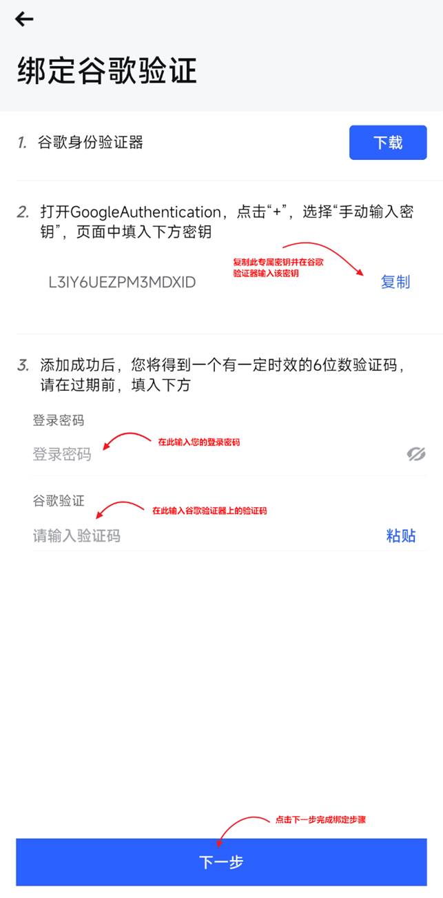 回到ZKE APP输入您账户的登录密码以及谷歌验证器里的验证码,点击下一步完成绑定。