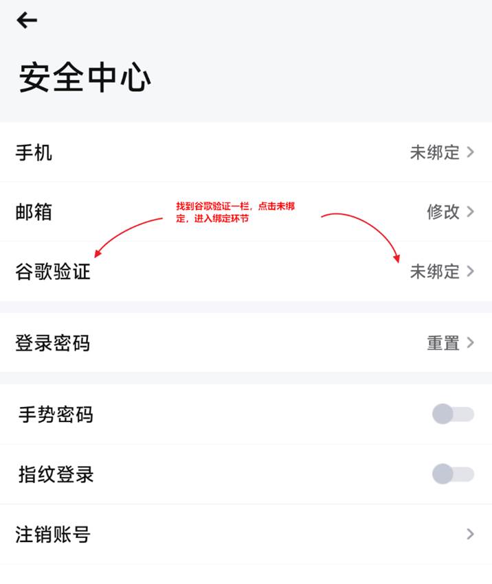 在安全中心栏目下找到谷歌验证,点击右侧的未绑定,进入绑定环节。