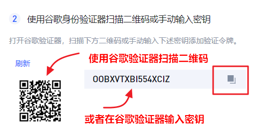 使用谷歌验证器扫描你页面上的专属二维码或手动在谷歌验证器输入密钥
