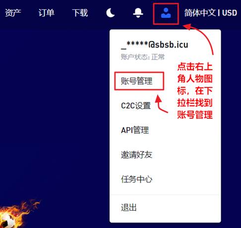 在手机上下载谷歌身份验证器,登录ZKE账户,在网页右上角找到人物头像图标,在下拉栏选项中找到“账号管理”,如图: