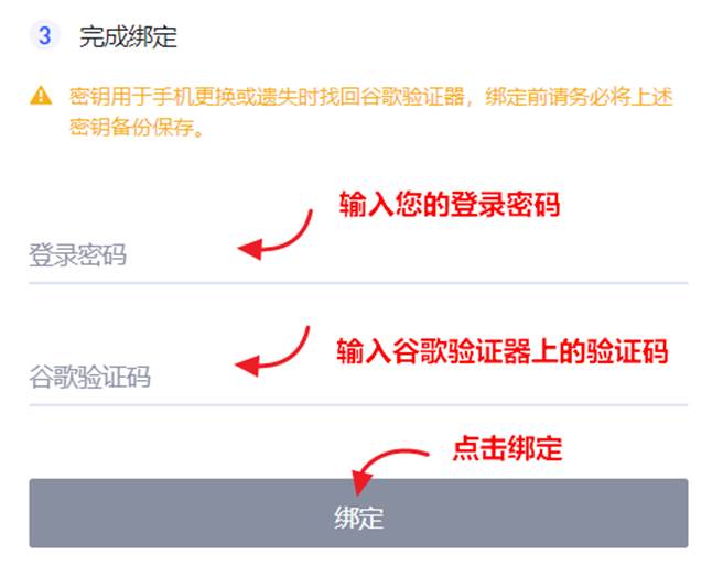 输入您的登录密码以及谷歌验证器上显示的验证码,最后点击绑定按钮,完成绑